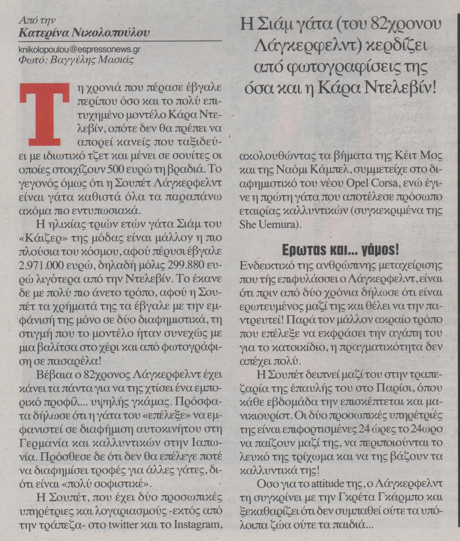 Τη χρονιά που πέρασε έβγαλε περίπου όσα και το πολύ επιτυχημένο μοντέλο Κάρα Ντελεβίν, οπότε δε θα πρέπει να απορεί κανείς που κυκλοφορεί με ιδιωτικό τζετ και μένει σε σουίτες οι οποίες στοιχίζουν 500 ευρώ τη βραδιά. Το γεγονός όμως ότι η Σουπέτ Λάγκερφελντ είναι γάτα καθιστά όλα τα παραπάνω ακόμη πιο εντυπωσιακά.