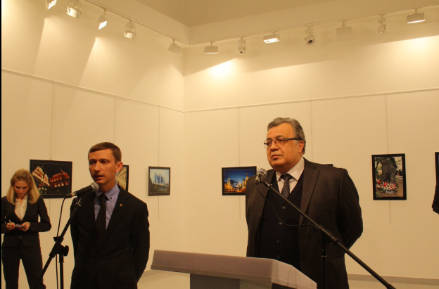 Δείτε τις φωτογραφίες λίγο πριν από την επίθεση στον Ρώσο Πρέσβη. Ο δράστης μπήκε στη γκαλερί όπου γινόταν μια έκθεση φωτογραφίας με αστυνομική ταυτότητα και πυροβόλησε τον Αντρέι Καρλόφ την ώρα που μιλούσε.
