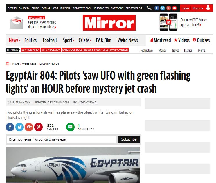 Πιλότοι της Turkish Airlines ισχυρίζονται ότι είδαν να πετάει στον ουρανό ένα άγνωστο αντικείμενο με πράσινα φώτα μία ώρα πριν από τη συντριβή του μοιραίου αεροσκάφους της EgyptAir, όπως αναφέρει σε δημοσίευμα της η Mirror.
