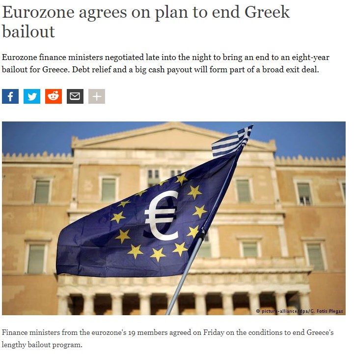 Η διάσωση της Ελλάδας τερματίζεται ύστερα από οκτώ χρόνια. Η χώρα θα λάβει ακόμα μερικά δισεκατομμύρια και ελάφρυνση του χρέους, όπως συμφώνησαν οι χώρες του ευρώ. Από τον Αύγουστο, θα πρέπει να χρηματοδοτηθεί και πάλι μέσω της κεφαλαιαγοράς.