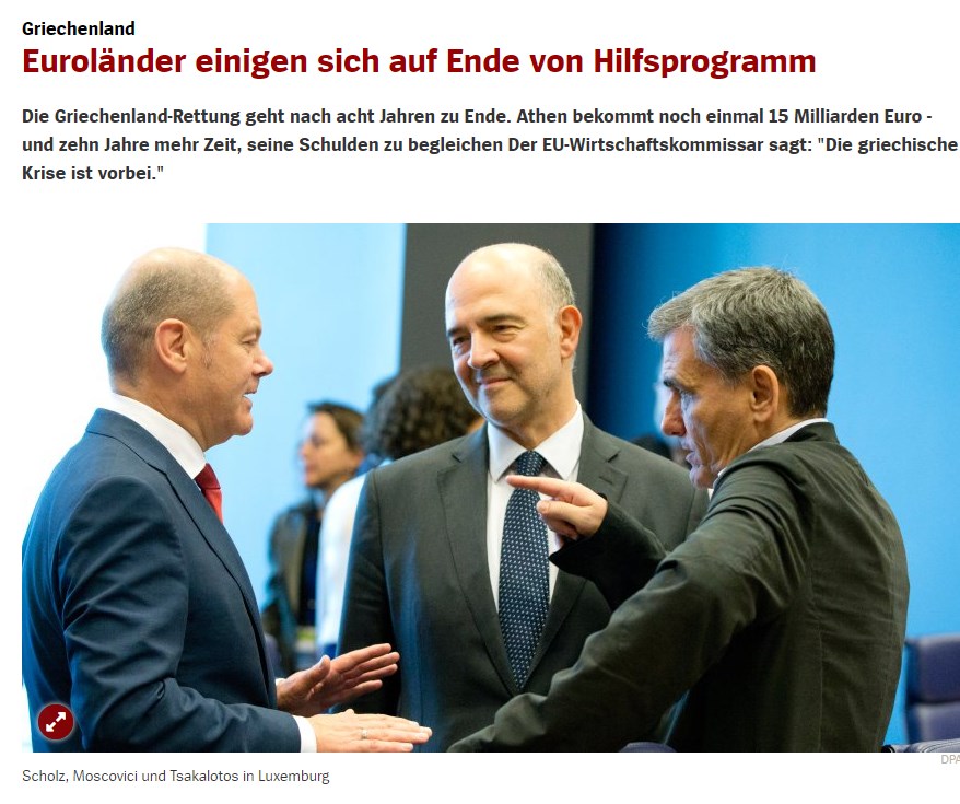 Η επιχείρηση διάσωσης της Ελλάδας τερματίζεται ύστερα από οκτώ χρόνια. Η υπερχρεωμένη χώρα παίρνει και πάλι φρέσκα δισεκατομμύρια σε δάνεια και ελάφρυνση του χρέους και μπορεί έτσι από τον Αύγουστο να σταθεί οικονομικά και πάλι στα πόδια της. Αυτό συμφωνήθηκε από τη Γερμανία και τις άλλες χώρες του ευρώ με την ελληνική κυβέρνηση, κατά τη διάρκεια της νύχτας. Οι συμμετέχοντες γιόρτασαν αυτή την τελευταία μεγάλη προσπάθεια ως ιστορική επιτυχία.