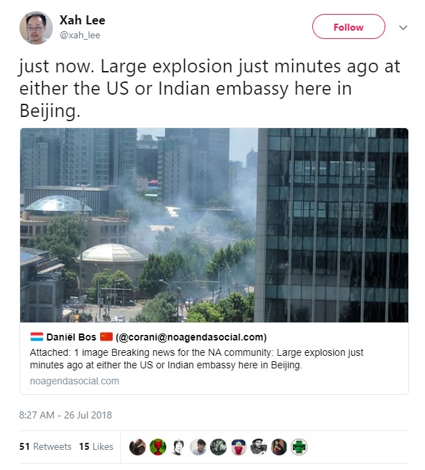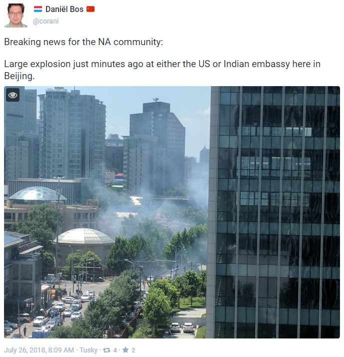 Η αμερικανική πρεσβεία βρίσκεται στην Chaoyang District. Αυτόπτες μάρτυρες έχουν αναρτήσει στο twitter φωτογραφίες και βίντεο.