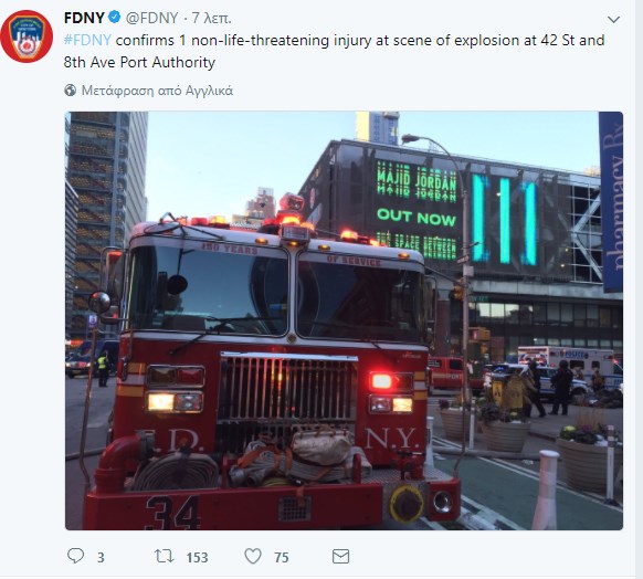 Έναν τραυματία, η υγεία του οποίου δεν διατρέχει κίνδυνο, επιβεβαιώνει η πυροσβεστική της Νέας Υόρκης, μετά την έκρηξη στο σταθμό λεωφορείων.