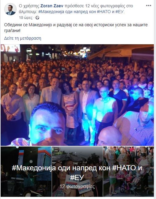 Ο Ζόραν Ζάεφ χαρακτήρισε τα πάρτι στις 15 πόλεις ως «πρόσκληση για ενότητα, με όλες τις πολιτικές διαφορές μας, για τους στρατηγικούς στόχους της χώρας μας, την ένταξη σε ΕΕ και ΝΑΤΟ». «Αυτό που πέτυχε η “Μακεδονία” σε ένα χρόνο είναι επιτυχία όλων μας. Έχουμε λόγους να πανηγυρίζουμε και να ξεπεράσουμε τις διαφωνίες μας», είπε ο κ. Ζάεφ, θέλοντας να κερδίσει πόντους ενόψει του δημοψηφίσματος στην χώρα.