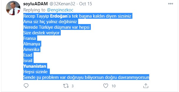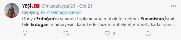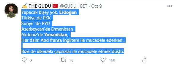 Στο ίδιο ύφος κινείται και έτερος χρήστης των social media. Επί της ουσίας κατηγορεί τον Ρετζέπ Ταγίπ Ερντογάν για τα μέτωπα που έχει ανοίξει στο εξωτερικό, την ώρα που στο εσωτερικό της χώρας η κατάσταση δεν είναι καθόλου καλή. Τα οικονομικά προβλήματα με την κατρακύλα της λίρας είναι τεράστια, υπάρχουν τεράστιες ανατιμήσεις σε προϊόντα και η καθημερινότητα των πολιτών έχει γίνει πολύ δύσκολη. Έτσι απαριθμεί τα μέτωπα που έχει ανοίξει ο «σουλτάνος» και καταλήγοντας αναφέρει πως «εναπόκειται σε εμάς να παλέψουμε με το σκορβούτο στη χώρα».