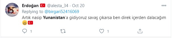 Άλλος χρήστης του Twitter ειρωνεύεται τον Ερντογάν για τις απειλές πολέμου και τις εμπρηστικές δηλώσεις που έχει εκτοξεύσει πολλάκις το τελευταίο διάστημα κατά της Ελλάδας. Στις 20 Οκτωρβίου ανέφερε χαρακτηριστικά ότι «μέχρι την Πέμπτη θα είμαι στην Ελλάδα, πείτε στον Σελτζούκ να μην χτυπήσει με τα SIHA (σ.σ. είναι τα αεροπλάνα χωρίς πιλότους για χτυπήματα σε στόχους)».