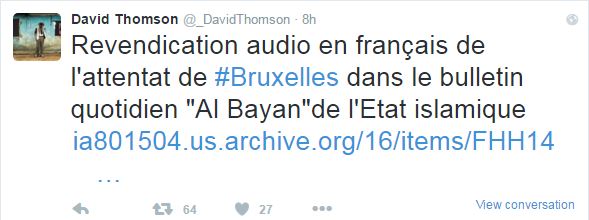 «Με την ευλογία του Αλλάχ, ένα μυστικός πυρήνας στρατιωτών του Χαλιφάτου στους οποίους ο Αλλάχ έδωσε δύναμη και νίκη έβαλαν στο στόχαστρο τους σταυροφόρους του Βελγίου που μάχεται το Ισλαμικό Κράτος και τους μουσουλμάνους. Ο Αλλάχ έδωσε τη νίκη στους αδελφούς μας και έβαλε το φόβο στις καρδιές των σταυροφόρων στην ίδια τους τη χώρα. Οι μαχητές του Χαλιφάτου φορώντας ζώνες με εκρηκτικά και κρατώντας τουφέκια και βόμβες έβαλαν στο στόχαστρο καλά επιλεγμένα μέρη στη βελγική πρωτεύουσα στις Βρυξέλλες, στο αεροδρόμιο Zaventem και στο σταθμό του μετρό, για να σκοτώσουν έναν μεγάλο αριθμό σταυροφόρων. Πυροδότησαν τα εκρηκτικά που κουβαλούσαν μαζί τους ανάμεσα στο πλήθος», αναφέρεται στο ηχητικό μήνυμα.