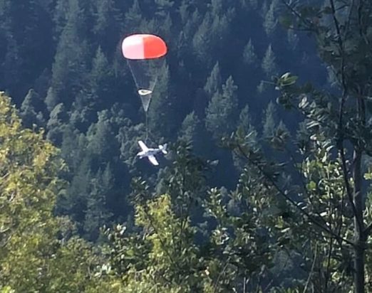 Το τεράστιο αλεξίπτωτο μετέφερε το αεροσκάφος μέχρι που τελικά συνετρίβη σε δέντρα στο κατάφυτο έδαφος.