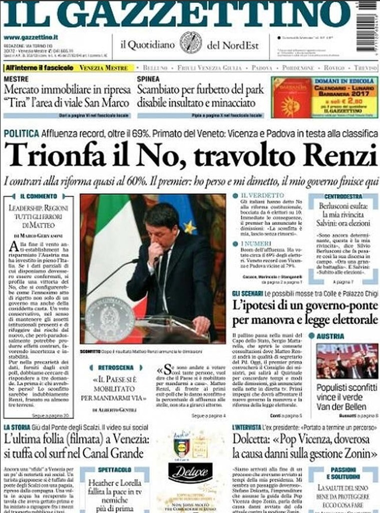 IL GAZZETTINΟ: ”Θριαμβεύει το ΟΧΙ, συγκλονισμένος ο Ρέντσι”
