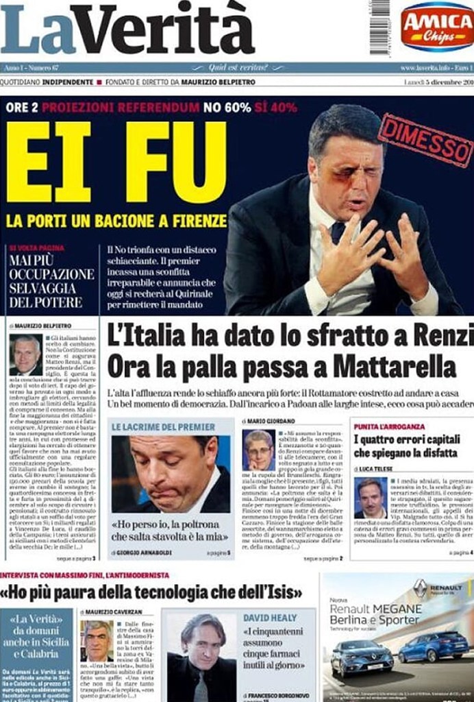 «Αναλαμβάνω την ευθύνη της ήττας», δήλωσε ο Ιταλός Πρωθυπουργός Ματέο Ρέντσι σε τηλεοπτικό του διάγγελμα.