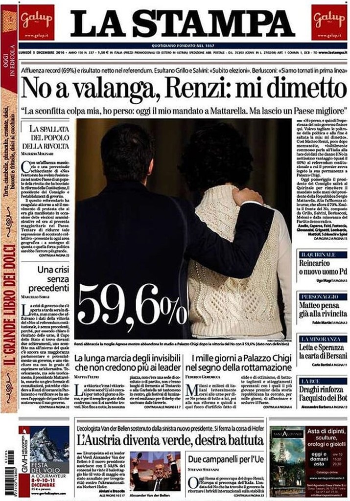 La Stampa: ”Η χιονοστιβάδα του ΟΧΙ, Ρέντσι: Παραιτούμαι”