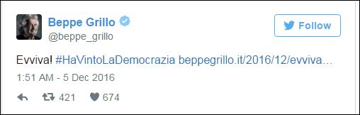Λίγα λεπτά μετά την παραίτηση του Ιταλού Πρωθυπουργού, Ματέο Ρέντσι λόγω της ήττας του «ναι» στο δημοψήφισμα, ο Μπέμπε Γκρίλο τουίταρε τη λέξη «Εβίβα» παραπέμποντας σε μήνυμα που έχει αναρτήσει στην ιστοσελίδα του.