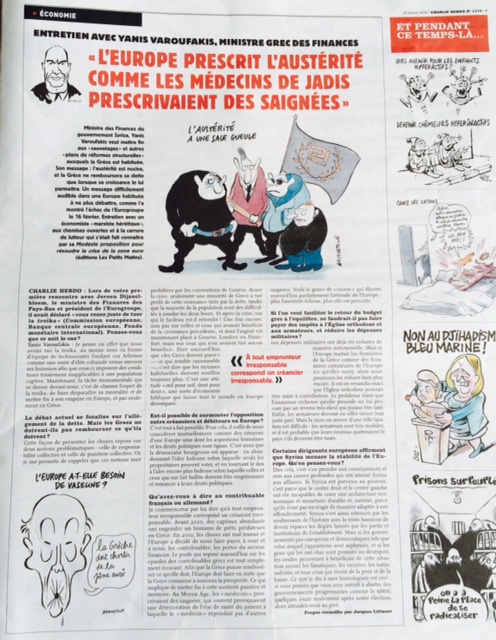 “H λιτότητα είναι βλαβερή και η Ελλάδα θα εξοφλήσει το χρέος της όταν η ανάπτυξη θα της το επιτρέψει” αναφέρει ο υπουργός Οικονομικών Γιάνης Βαρουφάκης στη συνέντευξή του στο σατιρικό περιοδικό Charlie Hebdo.