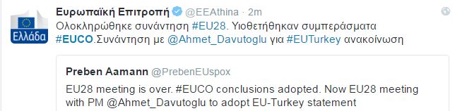 Ολοκληρώθηκε πριν από λίγο η Σύνοδος Κορυφής των 28 για το προσφυγικό, σύμφωνα με tweet της Ευρωπαϊκής Επιτροπής.