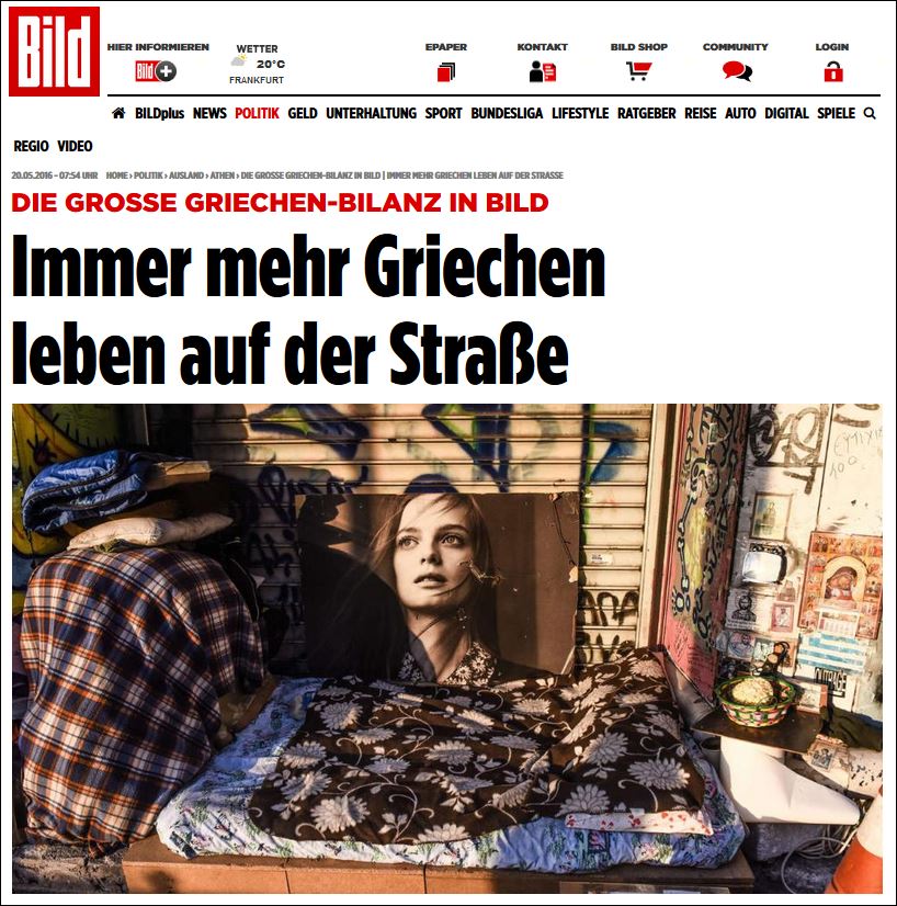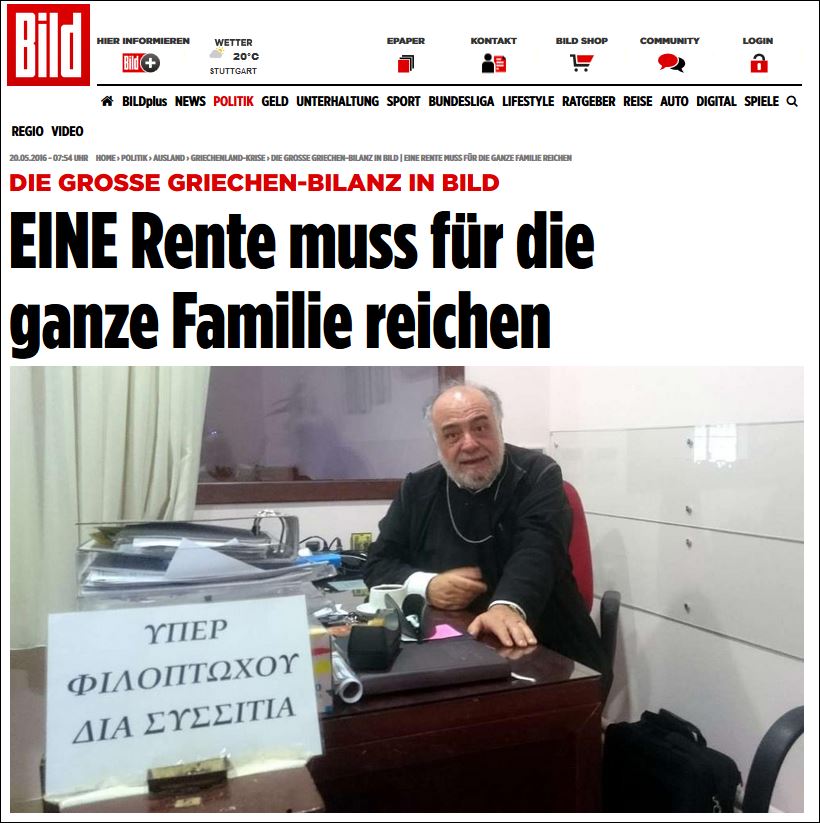 «Με μία σύνταξη καλείται να ανταπεξέλθει μία ολόκληρη οικογένεια» είναι ο τίτλος δημοσιεύματος της Bild που αναφέρεται στην αύξηση της φτώχειας στην Ελλάδα. Η γερμανική εφημερίδα σημειώνει ότι υπάρχουν οικογένειες που ζουν με μία σύνταξη ενώ τα χρήματα δεν επαρκούν ούτε για τη σίτισή τους, και αναφέρεται εκτενώς στα συσσίτια της εκκλησίας στα οποία αναγκάζονται να καταφύγουν οι πολίτες.