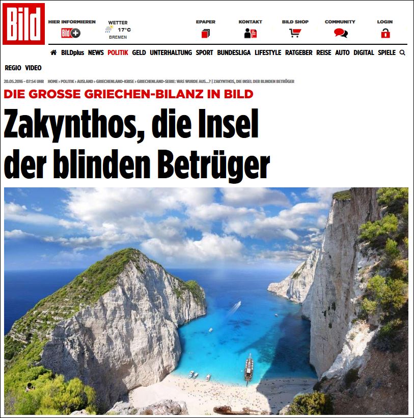 «Ήταν το σύμβολο της διαφθοράς» γράφει η γερμανική εφημερίδα σε δημοσίευμά της με τίτλο «Ζάκυνθος, το νησί των τυφλών απατεώνων». Η Bild σημειώνει ότι «στη Ζάκυνθο, περισσότερα από 700 άτομα έπαιρναν επίδομα τυφλότητας. Οι περισσότεροι από αυτούς ήταν απατεώνες».
