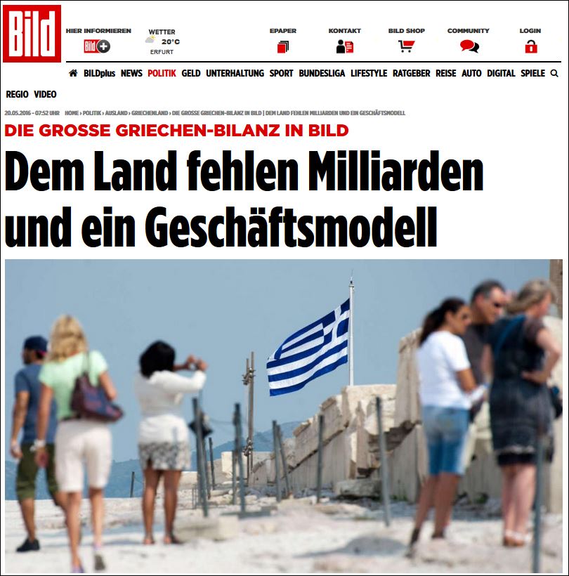 Η Bild υπογραμμίζει ότι «οι ελληνικές επιχειρήσεις κλείνουν ή μεταφέρουν την έδρα τους στο εξωτερικό. Στη χώρα λείπει η στρατηγική –εκτός από τον τουρισμό- προκειμένου να βγάλουν λεφτά» σημειώνει η εφημερίδα κάνοντας λόγο για «έλλειψη μερικών δισεκατομμυρίων αλλά και ενός επιχειρηματικού μοντέλου» προκειμένου να αναπτυχθεί η οικονομία.