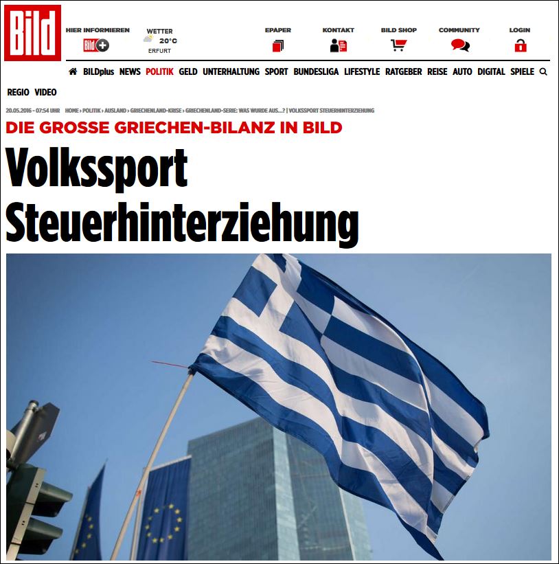 «Ο ελεγκτικός φορολογικός μηχανισμός υπάρχει μόνο στα χαρτιά ενώ η φοροδιαφυγή έχει εξελιχθεί σε δημοφιλή ‘δραστηριότητα’ στη χώρα» τονίζει η Bild σε δημοσίευμά της με τίτλο «Εθνικό σπορ η φοροδιαφυγή».