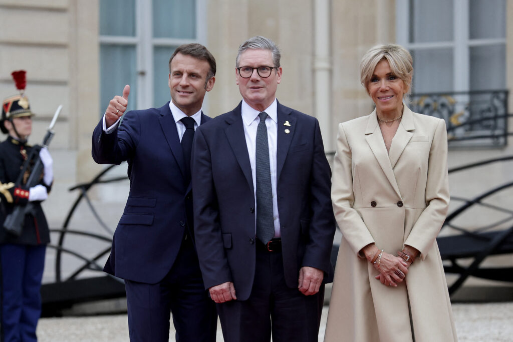 France’s President Emmanuel Macron (L) and his wife Brigitte Macron (R) greet Britain’s Prime Minister Keir Starmer (C) on arrival ahead of a reception for heads of state and governments ahead of the opening ceremony of the Paris 2024 Olympic Games, at the Elysee presidential palace in Paris, on July 26, 2024. (Photo by Valentine CHAPUIS / AFP)