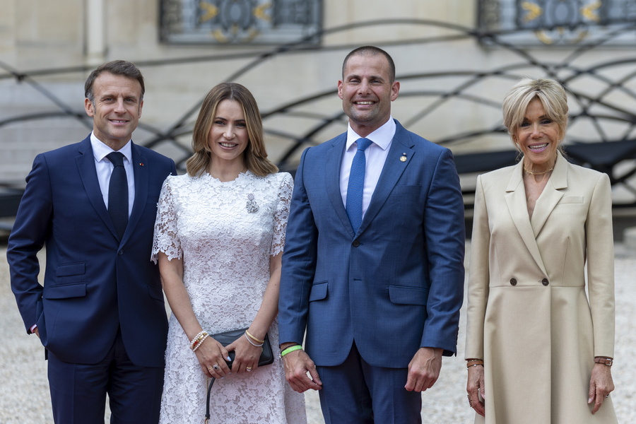 epa11497578 French President Emmanuel Macron (L) and his wife Brigitte (R) pose for a photo with Malta’s Prime Minister Robert Abela (2-R) and his wife Lydia Abela (2-L) as they arrive at a reception hosted by French President Macron and his wife at the Elysee Palace in Paris, France, 26 July 2024, ahead of the Opening Ceremony of the Paris 2024 Olympic Games. More than a hundred heads of state and government will attend the opening ceremony, which will be held on the evening of 26 July on the banks of the river Seine in Paris. It is the first time that an Olympic Opening Ceremony will not take place in a stadium. The Olympics will run until 11 August 2024. EPA/ANDRE PAIN