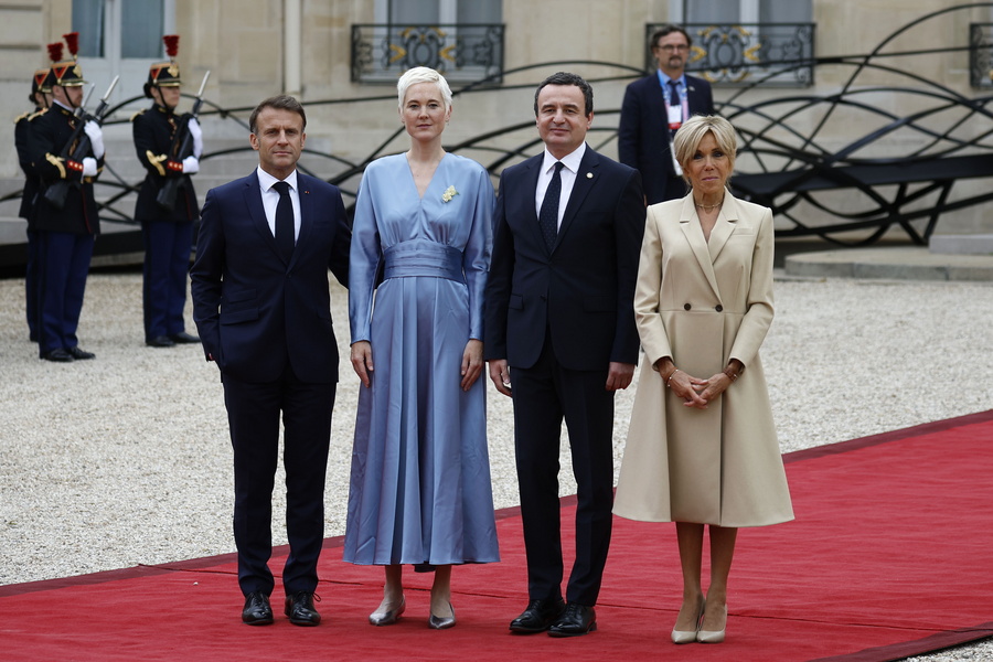 epa11497592 French President Emmanuel Macron (L) and his wife Brigitte (R) pose for a photo with Kosovo’s Prime Minister Albin Kurti and his wife Rita Augestad Knudsenat as they arrive a reception hosted by French President Macron and his wife at the Elysee Palace in Paris, France, 26 July 2024, ahead of the Opening Ceremony of the Paris 2024 Olympic Games. More than a hundred heads of state and government will attend the opening ceremony, which will be held on the evening of 26 July on the banks of the river Seine in Paris. It is the first time that an Olympic Opening Ceremony will not take place in a stadium. The Olympics will run until 11 August 2024. EPA/ANDRE PAIN