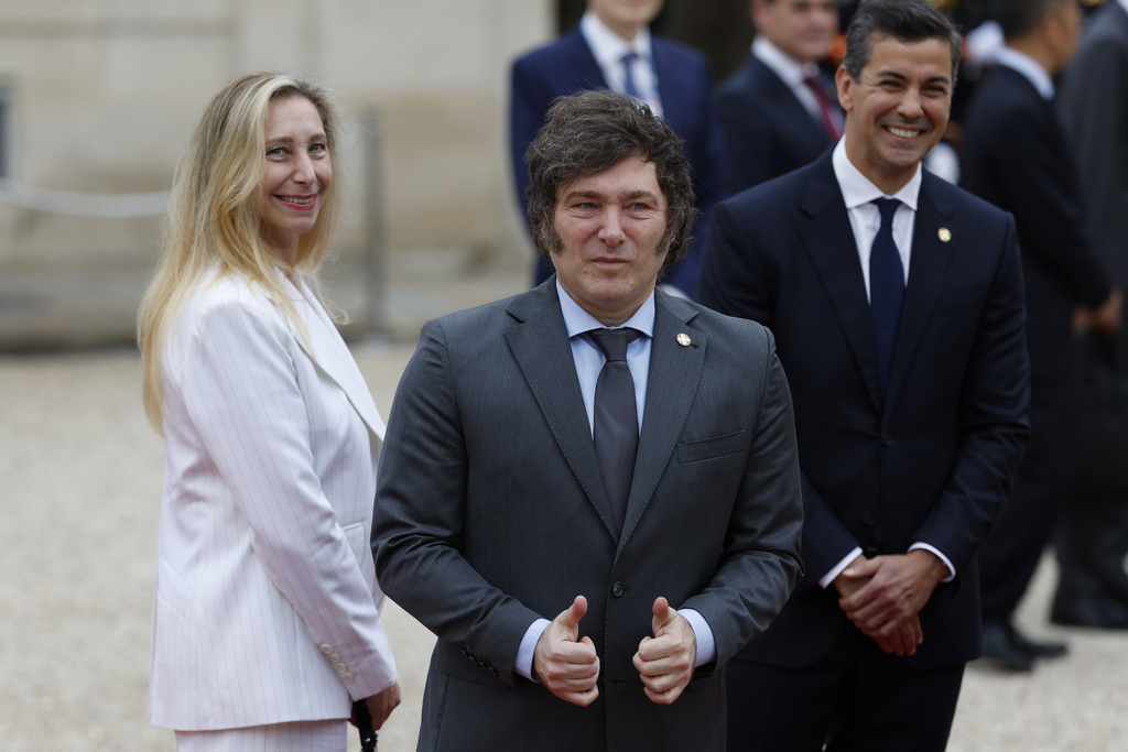 Argentina’s President Javier Milei thumbs up ahead of an opening ceremony in which 7,000 Olympic athletes are due to sail down the Seine past iconic Parisian monuments, at the 2024 Summer Olympics, Friday, July 26, 2024, at the Elysee Palace in Paris, France. (AP Photo/Aurelien Morissard)