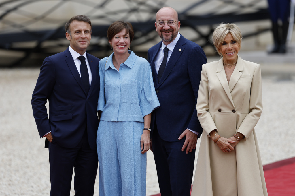 French President Emmanuel Macron and his wife Brigitte Macron, right, welcome European Council President Charles Michel and his wife Amélie Derbaudrenghien Michel ahead of an opening ceremony in which 7,000 Olympic athletes are due to sail down the Seine past iconic Parisian monuments, at the 2024 Summer Olympics, Friday, July 26, 2024, at the Elysee Palace in Paris, France. (AP Photo/Aurelien Morissard)