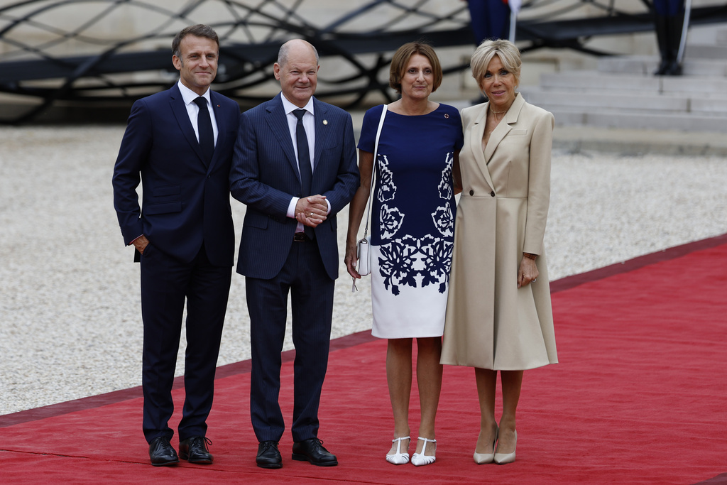 German Chancellor Olaf Scholz and his wife Bitta Ernst are welcomed by French President Emmanuel Macron, left, and his wife. Brigitte Macron ,at the Elysee Palace, ahead of an opening ceremony in which 7,000 Olympic athletes are due to sail down the Seine past iconic Parisian monuments, at the 2024 Summer Olympics, Friday, July 26, 2024, in Paris, France. (AP Photo/Aurelien Morissard)