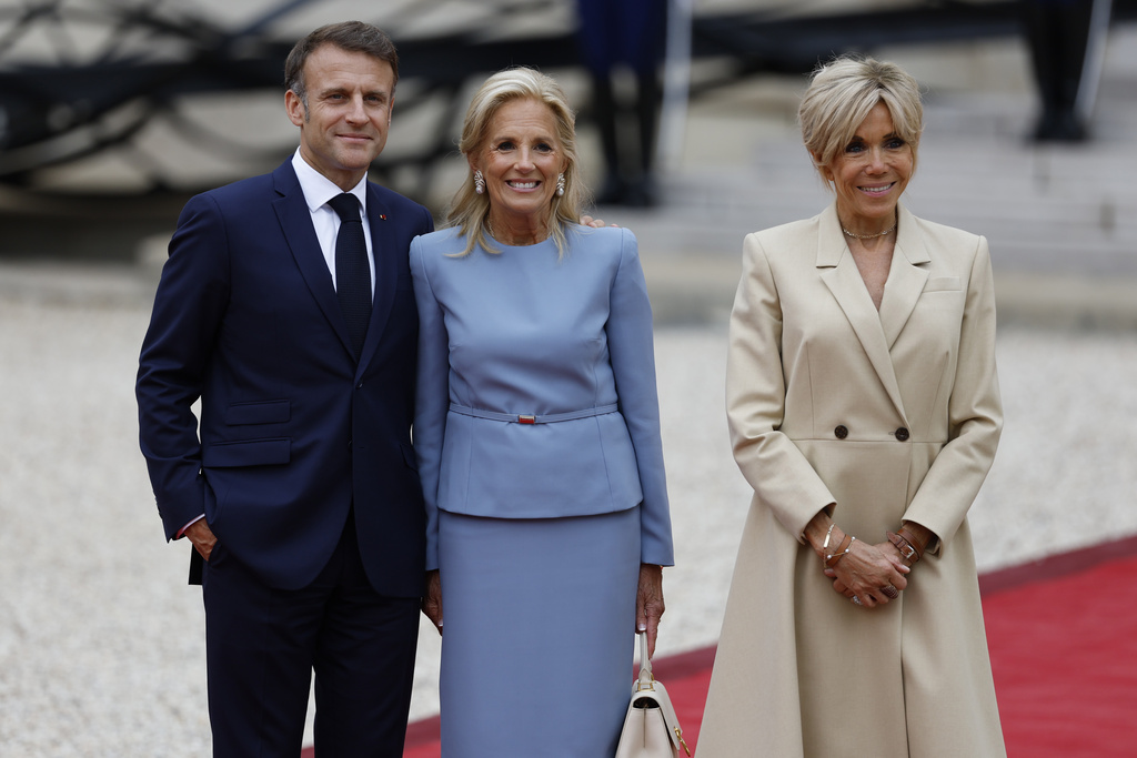 French President Emmanuel Macron and his wife Brigitte Macron, right, poses with First lady Jill Biden at the Elysee Palace ahead of an opening ceremony in which 7,000 Olympic athletes are due to sail down the Seine past iconic Parisian monuments, at the 2024 Summer Olympics, Friday, July 26, 2024, in Paris, France. (AP Photo/Aurelien Morissard)