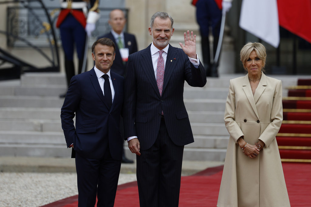 Spain’s King Felipe II, center, waves as he is welcomed by French President Emmanuel Macron and his wife Brigitte Macron at the Elysee Palace ahead of an opening ceremony in which 7,000 Olympic athletes are due to sail down the Seine past iconic Parisian monuments, at the 2024 Summer Olympics, Friday, July 26, 2024, in Paris, France. (AP Photo/Aurelien Morissard)