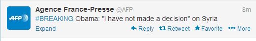 «Δεν έχω πάρει κάποια απόφαση για τη Συρία» αναφέρει ο Αμερικανός πρόεδρος Μπαράκ Ομπάμα.