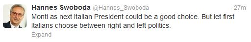 “Ο Μόντι θα μπορούσε να είναι μια καλή επιλογή για επόμενος πρόεδρος της Ιταλικής Δημοκρατίας. Αλλά ας αφήσουμε πρώτα τους Ιταλούς να επιλέξουν ανάμεσα στην δεξιά και την αριστερή πολιτική”, έγραψε ο κ. Σβόμποντα στο Twitter.