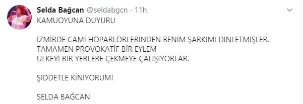 Η ίδια η τραγουδίστρια σε ανάρτησή της στο twitter κάνει λόγο για πρόκληση: “Ανακοίνωση προς το κοινό. Είπαν ότι το τραγούδι μου ακούστηκε από τους μιναρέδες των τζαμιών στη Σμύρνη. Μία απολύτως προκλητική πράξη. Προσπαθούν να παρασύρουν κάπου τη χώρα, πιστεύω στη βία!” έγραψε.