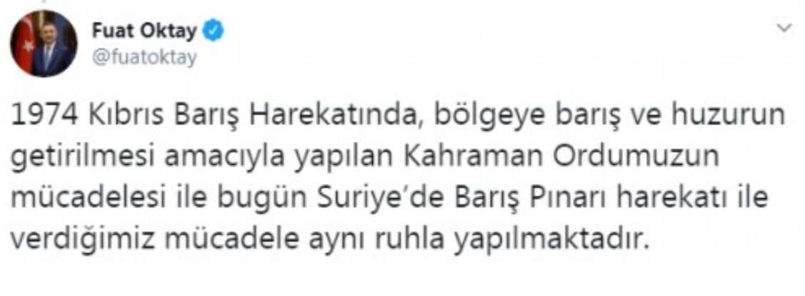 Πρόσθεσε πως, “στην ‘Κυπριακή Ειρηνευτική Επιχείρηση’ του 1974, ο αγώνας του Ηρωικού Στρατού μας, ο οποίος διεξήχθη με στόχο την ειρήνη στην περιοχή, και ο αγώνας συνεχίζεται με την επιχείρηση ‘Ειρήνης της Ειρήνης’ στη Συρία KAI διεξάγεται με τον ίδιο πνεύμα. Η δήλωση του Ακιντζί με την ιδιότητά του ως Προέδρου σήμερα είναι μια δήλωση που στερείται ιστορικής συνείδησης και γνώσης. Πιστεύω ότι αυτή η ατυχής δήλωση δεν αντικατοπτρίζει τη γνώμη των Τουρκοκυπρίων”.