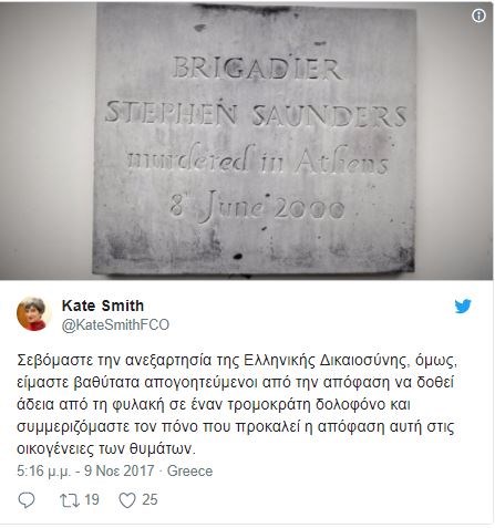 «Σεβόμαστε την ανεξαρτησία της Ελληνικής Δικαιοσύνης, όμως, είμαστε βαθύτατα απογοητευμένοι από την απόφαση να δοθεί άδεια από τη φυλακή σε έναν τρομοκράτη δολοφόνο και συμμεριζόμαστε τον πόνο που προκαλεί η απόφαση αυτή στις οικογένειες των θυμάτων» έγραψε στο Twitter η κ. Σμίθ.