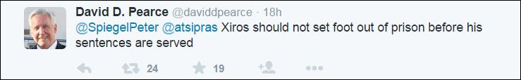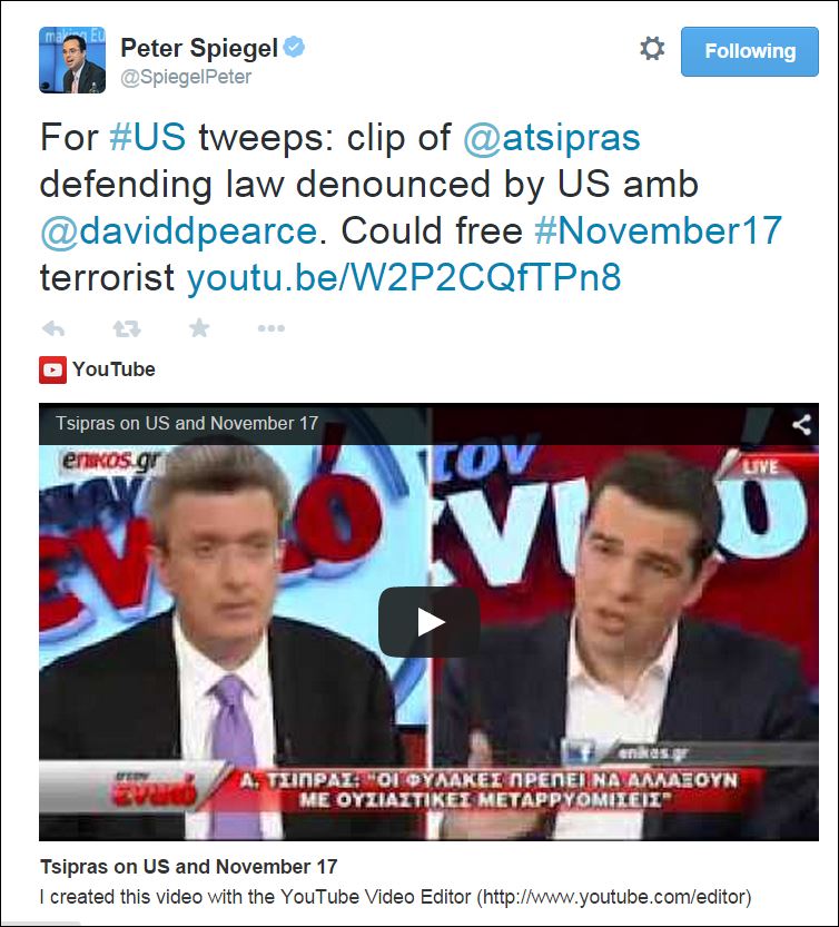 Την αντίδραση του Αμερικανού πρέσβη David Pearce προκάλεσε το απόσπασμα που ανέβασε στο twitter ο δημοσιογράφος των Financial Times, Peter Spiegel από την συνέντευξη του Πρωθυπουργού στον Νίκο Χατζηνικολάου, «στον ενικό».