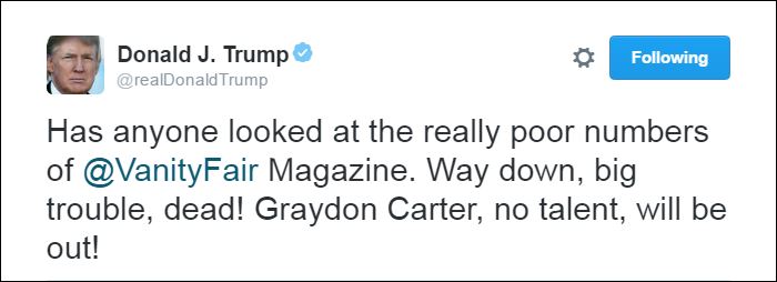 «Έχει κανείς κοιτάξει τα πραγματικά φτωχά νούμερα του Vanity Fair. Καθοδική πτώση, μεγάλα προβλήματα, νεκρό! Graydon Carter, κανένα ταλέντο, θα εκδιωχθείς», έγραψε χαρακτηριστικά κάνοντας επίθεση στον εκδότη του περιοδικού.