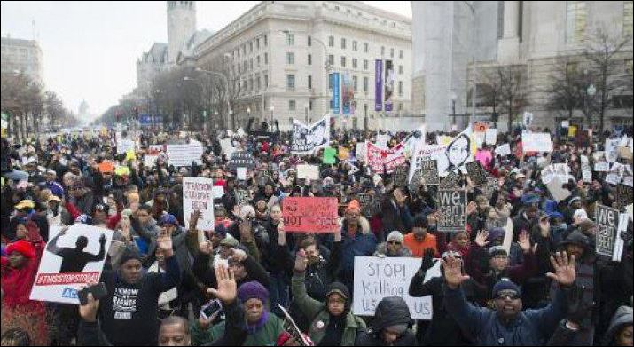 Παρούσες στην πορεία οι οικογένειες του 17χρονου μαύρου Τρέιβον Μάρτιν που έπεσε νεκρός τον Φεβρουάριο του 2012 στη Φλόριντα, του 12χρονου Ταμίρ Ράις που πυροβολήθηκε θανάσιμα στο Κλίβελαντ στα τέλη Νοεμβρίου ενώ έπαιζε με ένα ψεύτικο όπλο, του 28χρονου Ακάι Γκάρλεϊ που σκοτώθηκε “από λάθος” λευκού αστυνομικού στα τέλη Νοεμβρίου στο Μπρούκλιν.