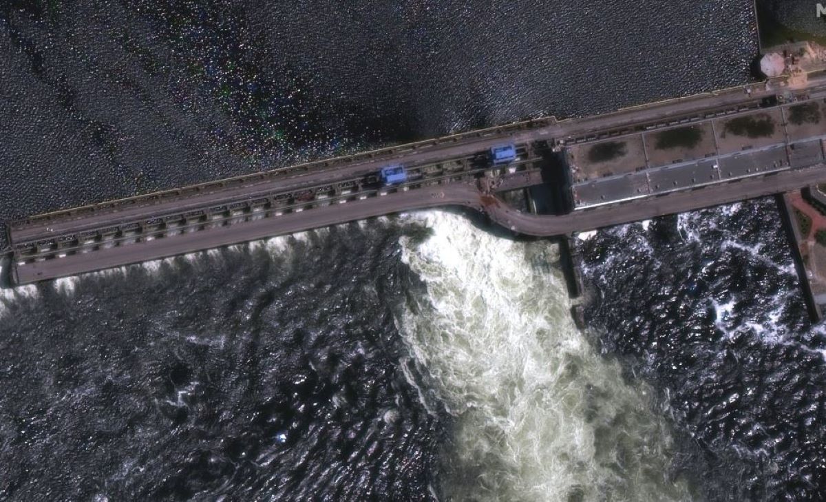 New satellite imagery of the Khakovka dam from June 5 shows evidence that a section of the roadway and sluice gates had been recently damaged or destroyed.