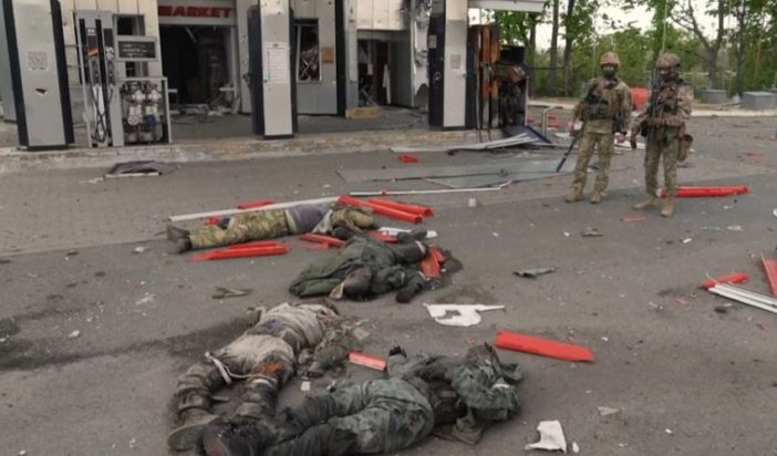 Η φωτογραφία προέρχεται από βίντεο που μετέδωσε το Ασοσιέητεντ Πρες και δείχνει πτώματα στρατιωτών τοποθετημένα έτσι στο δρόμο, ώστε να αναπαριστούν το γράμμα “Ζ”, που είναι χαρακτηριστικό των ρωσικών δυνάμεων που έχουν εισβάλλει στην Ουκρανία. Η φρικτή φωτογραφία ελήφθη στις 2 Μαΐου και αναρτήθηκε στις 3 Μαΐου στο ειδησεογραφικό πρακτορείο με την εξής λεζάντα: