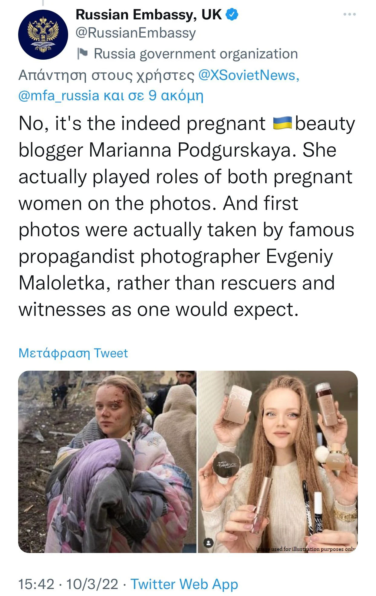 Ωστόσο, η ρωσική πρεσβεία στη Βρετανία με ανάρτησή της στο twitter, είχε ισχυριστεί ότι η έγκυος, τότε, γυναίκα με τα αίματα που εμφανίζεται στις φωτογραφίες από τον βομβαρδισμό του μαιευτηρίου στη Μαριούπολη, είναι ηθοποιός.