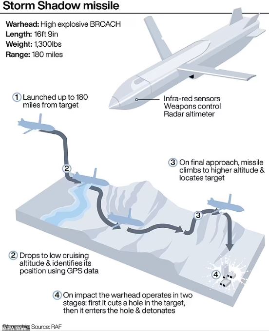 Οι πύραυλοι Storm Shadow της Βρετανίας είναι ικανοί να αποφεύγουν την αεράμυνα – καθιστώντας τους ένα εφιαλτικό όπλο επίθεσης για τον εχθρό. Οι πύραυλοι αξίας 800.000 λιρών χρησιμοποιούν τεχνολογία GPS για να ανατινάξουν με ακρίβεια τους στόχους και μπορούν να ταξιδέψουν στον αέρα με ταχύτητα 600 μίλια/ώρα.
