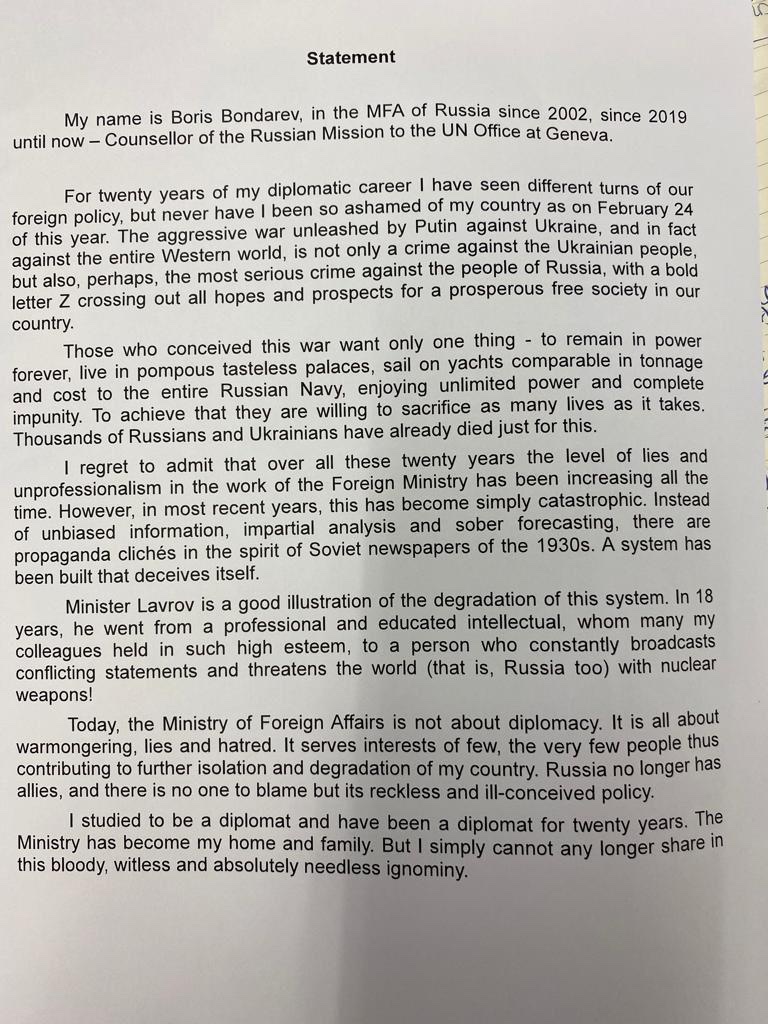 Ο Μπόνταρεφ προσθέτει, ότι υπήρξε διπλωμάτης για είκοσι χρόνια και το υπουργείο Εξωτερικών ήταν για τον ίδιο «το σπίτι του και η οικογένεια» του. «Όμως απλά δεν μπορώ να συμμετέχω πλέον σ’ αυτή την αιματηρή, χωρίς νόημα και εντελώς αχρείαστη ντροπή», καταλήγει στην δήλωση του.
