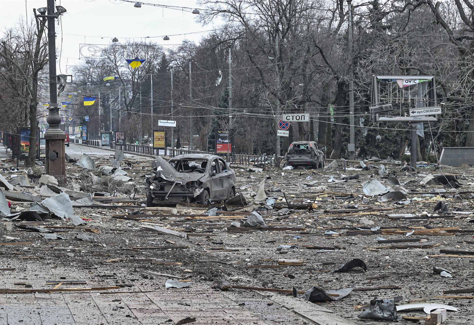 The center of #Kharkiv after the air strike. The occupants hit civilian infrastructure and passing cars. pic.twitter.com/rPaCiZr5Du