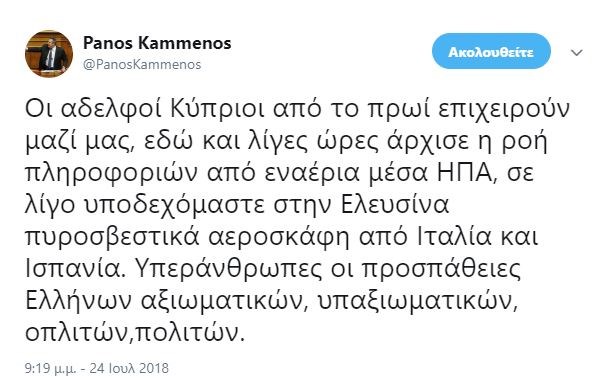 «Οι αδελφοί Κύπριοι από το πρωί επιχειρούν μαζί μας, εδώ και λίγες ώρες άρχισε η ροή πληροφοριών από εναέρια μέσα ΗΠΑ, σε λίγο υποδεχόμαστε στην Ελευσίνα πυροσβεστικά αεροσκάφη από Ιταλία και Ισπανία. Υπεράνθρωπες οι προσπάθειες Ελλήνων αξιωματικών, υπαξιωματικών, οπλιτών, πολιτών» αναφέρει αποψινή ανάρτηση του υπουργού Άμυνας, Πάνου Καμμένου, στον προσωπικό του λογαριασμό στο Twitter.