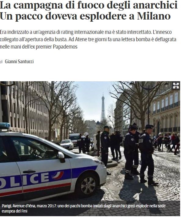 Η εφημερίδα του Μιλάνου αναφέρει, τέλος, ότι στελέχη της Αντιτρομοκρατικής δεν αποκλείουν το ενδεχόμενο να πραγματοποιηθούν και άλλες αποστολές εκρηκτικών δεμάτων μέσα στον Ιούνιο.