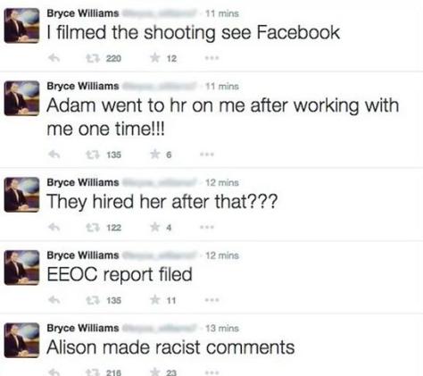 Ο 41χρονος δράστης αυτοπυροβολήθηκε λίγες ώρες μετά την αποτρόπαια πράξη του την ώρα που τον καταδίωκαν οι αστυνομικοί και άφησε επίσης την τελευταία του πνοή. Προτού αποφασίσει να δώσει τέλος στη ζωή του, έγραφε στο Twitter, σε λογαριασμό με το όνομα «Μπράις Γουίλιαμς», όνομα που χρησιμοποιούσε ως ψευδώνυμο όταν εργαζόταν στο τηλεοπτικό δίκτυο WDBJ7: