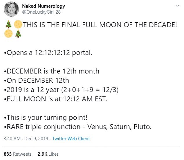 Η Πανσέληνος θα είναι ορατή, αν επιτρέψει ο νεφελώδης ουρανός, δώδεκα λεπτά μετά τα μεσάνυχτα, τον δωδέκατο μήνα του έτους και δώδεκα ημέρες πριν από τα Χριστούγεννα. Επίσης, το άθροισμα του 2019 είναι ο αριθμός 12 και όλοι επισημαίνουν τη σημειολογία της αποψινής πανσελήνου.