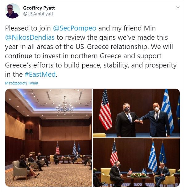 Η Αμερική στηρίζει τις προσπάθειες της Ελλάδας για οικοδόμηση ειρήνης, σταθερότητας και ευημερίας στην Ανατολική Μεσόγειο, όπως επισημαίνει ο Αμερικανός πρέσβης, Τζέφρι Πάιατ, ο οποίος συμμετείχε στη συνάντηση μεταξύ του υπουργού Εξωτερικών, Νίκου Δένδια και του Αμερικανού ομολόγου του, Μάικ Πομπέο, στη Θεσσαλονίκη.