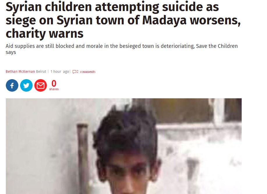 Γιατροί στην πόλη Μαντάγια της Συρίας, που παραμένει για μήνες αποκλεισμένη, αναφέρουν ότι τουλάχιστον έξι έφηβοι έχουν επιχειρήσει να βάλουν τέλος στη ζωή τους ελπίζοντας ότι με αυτόν τον τρόπο θα γλιτώσουν από τον εφιάλτη που ζουν.